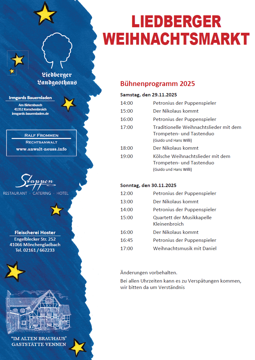 Der Liedberger Weihnachtsmarkt ist weit über seine Grenzen bekannt und beliebt. Er findet traditionell immer am 1. Adventwochenende, Samstags und Sonntags statt.
